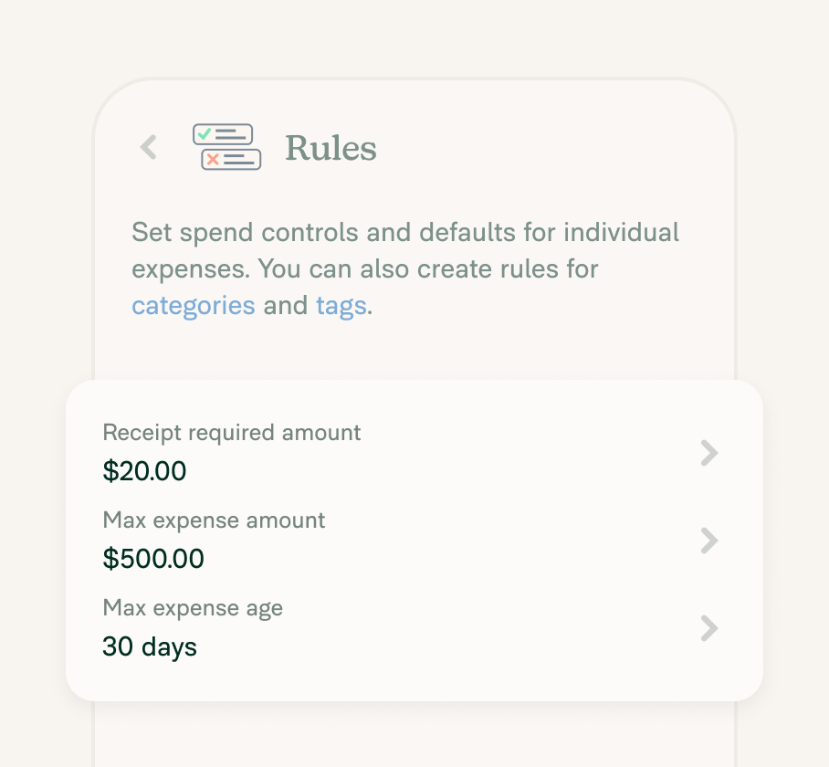 Spend less time reviewing expense reports or chasing policy violations. Expense approval rules guide compliant spending behavior from the moment a transaction is attempted.
