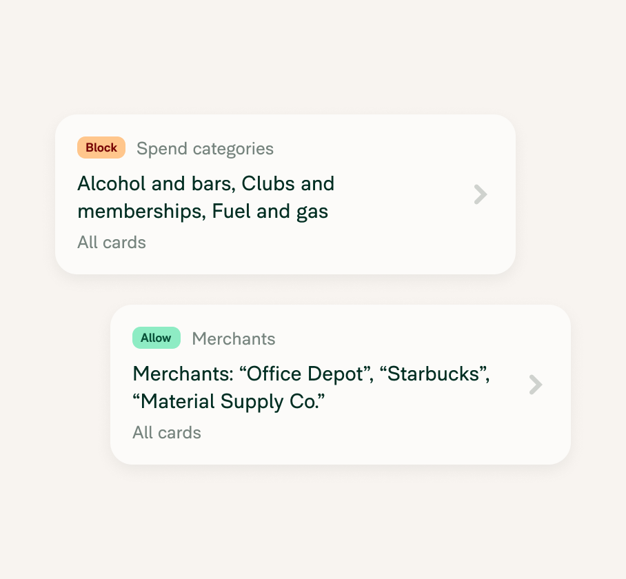 Define expense management rules by merchant, category, or transaction limits to support everything from business travel budgets to recurring spend like software subscriptions.