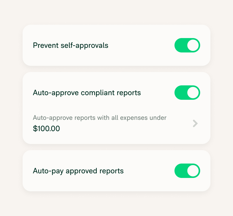 Clear expense approval rules give finance leaders the confidence to scale corporate card programs, reduce policy violations, and maintain visibility into company spend, all without relying on manual reviews.