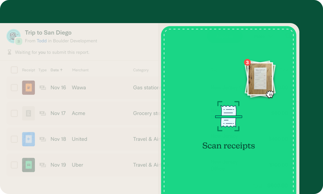 SmartScan technology reads receipts instantly, extracting merchant names, dates, amounts, and categories without manual data entry. Employees can: